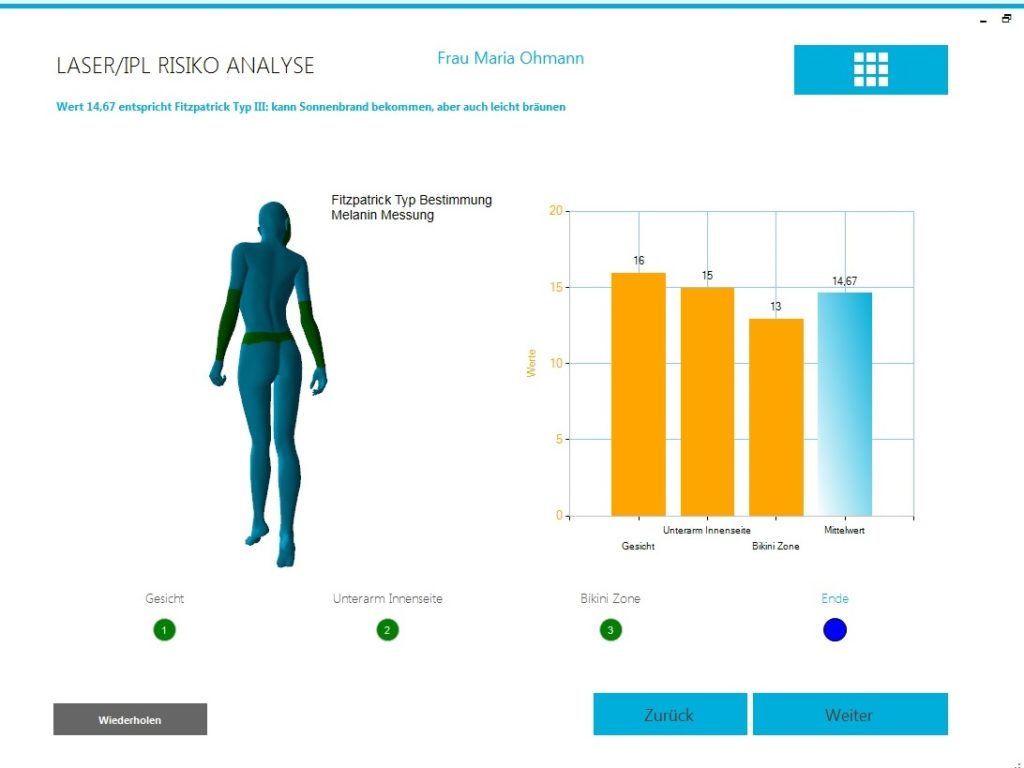 Un questionnaire vous guidera à travers des questions importantes lorsque vous travaillez avec de la lumière pulsée ou du laser sur la peau (par exemple sur l’exposition au soleil, les maladies de la peau, la couleur des poils, la consommation de certains produits pharmaceutiques, etc.). Si les réponses à ces questions indiquent des problèmes pour le traitement, un message apparaîtra. Après cela, le logiciel détermine le type de peau Fitzpatrick par des mesures de mélanine et compare la teneur en mélanine du site cutané à traiter à un site cutané complètement protégé du soleil. De plus, la valeur érythémateuse du site de traitement est enregistrée. Un résumé des résultats du questionnaire et de la mesure peut ensuite être combiné à un plan de traitement.